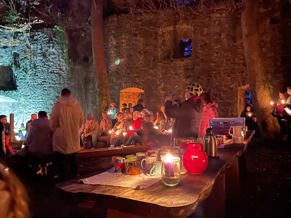 In der Ruine warteten schon zahlreiche Teilnehmende, und weitere kamen direkt vom Adventmarkt, so dass schließlich ca. 50 Personen die Andacht miteinander feiern konnten. Alle wurden mit einem Liedblatt, sowie einem Friedenslicht aus Bethlehem ausgestattet.