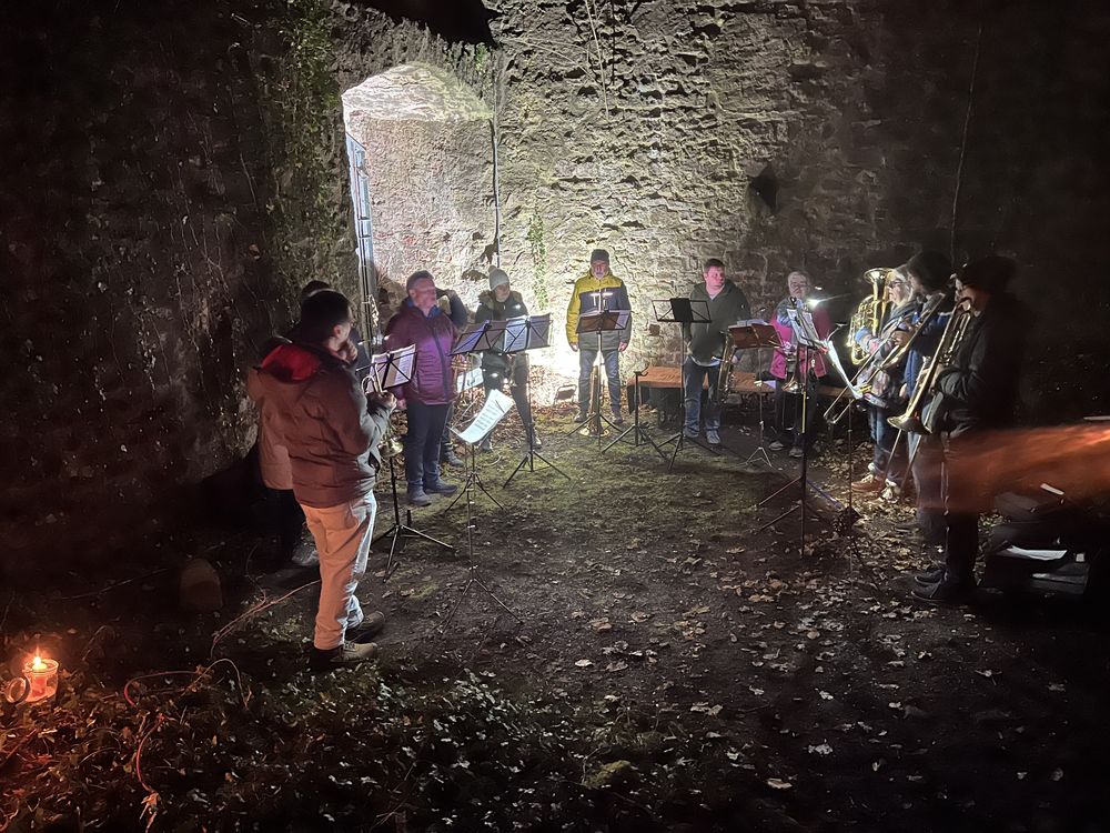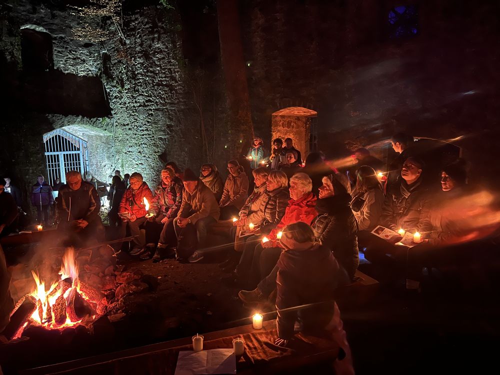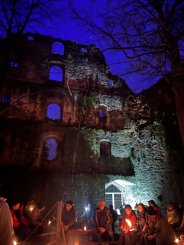 Samstag, 13. Dezember 2025 um 17:00 Uhr war es wieder soweit. Ca. 20 Personen, Große und Kleine, Alte und Junge, starteten wieder hinter der Evangelischen Stadtkirche zu einer Miniwanderung zur Ruine. Besonders die Kinder hatten großen Spaß und führten in diesem Jahr mit Fackeln und Taschenlampen den Zug durch den dunklen Schlosswald an. Oben angekommen, wurden sie in der wunderschön, mit unzählig vielen Kerzen und einem Weihnachtsbaum, geschmückten Ruine von einem großen Lagerfeuer und festlichen Klängen des Posaunenchors, aus Bläser:innen der Evangelischen und der Evangelisch-methodistischen Kirche, empfangen.