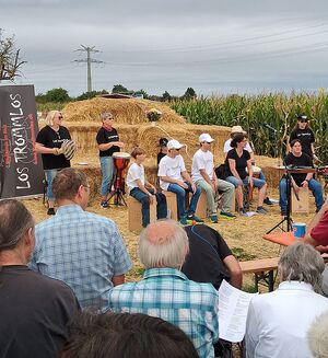 Der nächste Morgen ließ nicht lange auf sich warten. Bei strahlendem Sonnenschein bauten einige engagierte Mitarbeiter alles wieder auf, heizten schon mal den Grill und die Fritteuse an und bereiteten alles für den Gottesdienst und das Essen vor. Nach und nach trafen die Trommler von Los Trommlos ein, die den Gottesdienst mitgestalteten und ließen sich vor der großen Strohüpfburg nieder. Auch die Gottesdienstbesucher konnte man schon von weitem kommen sehen. Es wurden immer mehr und bald waren fast alle Sitzplätze besetzt. So feierten wir mit rund 130 Personen einen lebendigen, inspirierenden Gottesdienst, mit Stationen rund um das Thema Wasser, das auch in der Predigt eine zentrale Rolle spielte. So viele Leute waren noch nie beim Gottesdienst am Labyrinth, da waren sich alle einig, die schon öfter dabei waren! Im Anschluss an den Gottesdienst brauchte es natürlich unfassbare Mengen an Pommes, Gegrilltem, Mais, Getränken, Kaffee und Kuchen… Schon bald war manches einfach ausverkauft. Auch im Labyrinth war ein so unglaublicher Andrang, dass die Kulis fürs Gewinnspiel zeitweise nicht gereicht haben. Die Gäste kamen von nah und fern, um das Labyrinth zu erforschen. Viele waren zum ersten Mal da und waren sehr begeistert. Am weitesten angereist war eine Familie aus den USA.