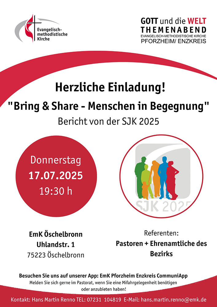 Die Pastoren und Ehrenamtliche des Bezirks werden uns von der Süddeutschen Jährlichen Konferenz der EmK (25. bis 29. Juni 2025 in Reutlingen und Fellbach) berichten.