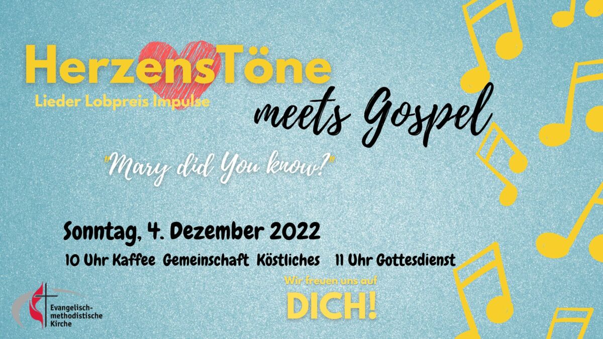 „HerzensTöne“ ist unsere Reihe besonderer musikalischer Gottesdienste mit Liedern, Lobpreis und musikalischen Impulsen. Am Sonntag, den 4. Dezember 2022 mischt sich dabei Adventliches mit Gospelklängen. "Mary did you Know?" - die unglaubliche Botschaft über Jesu Kommen begleitet uns durch diesen speziellen Advents-Gottesdienst.
