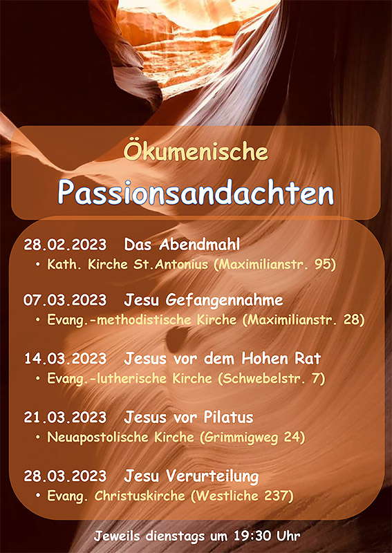 Auch in diesem Jahr laden die Kirchen der Pforzheimer Weststadt zu Ökumenischen Passionsandachten ein. In den ca. 30-minütigen Andachten stehen Abschnitte aus der Passionsgeschichte Jesu nach dem Matthäusevangelium im Mittelpunkt.
