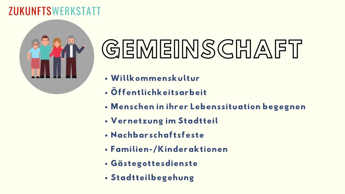 Bring Dich ein und gestalte mit! Welche Schwerpunkte wollen wir in der kommenden Zeit setzen? Was ist unser Auftrag in unserer Stadt? Mit welchen Aktionen sprechen wir Menschen an und gewinnen sie für den Glauben an Gott? Bring Dich ein und gestalte mit in der "Zukunftswerkstatt Gemeinde".
